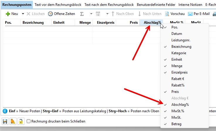 Sobald Sie als Rechnungsart die Abschlagsrechnung ausgewählt haben, stehen Ihnen zwei weitere Spalten "Abschlag %" und "Abschlag €" zur Verfügung. Blenden Sie diese per Rechtsklick in Ihrem Rechnungsdialog ein. Sie können immer nur entweder mit % oder mit € arbeiten. Beides gleichzeitig ist nicht möglich.