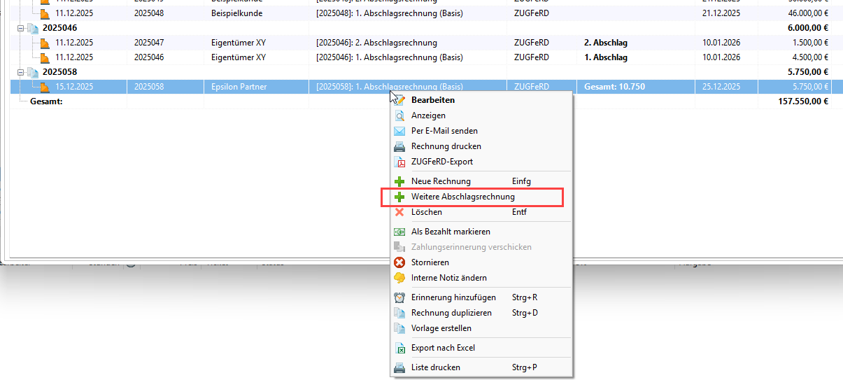 Um die nächste Abschlagsrechnung zu erstellen, klicken Sie mit der rechten Maustaste auf eine bestehende Rechnung. Wählen Sie dann "Weitere Abschlagsrechnung".