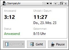 Auf der Zeitleiste ist dann die Gesamtarbeitszeit zu sehen und per Rechtsklick können Sie Kommt/Geht/Pause stempeln.