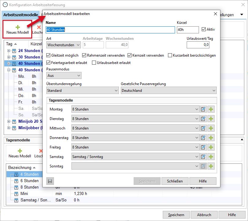 Über den Menüpunkt "Neues Modell" legen Sie ein Arbeitszeitmodell an.