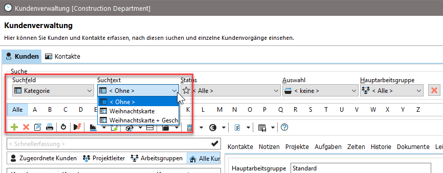 In der Kundenverwaltung können Sie dann Ihre Liste nach Kunden mit den gewählten Kategorien filtern.