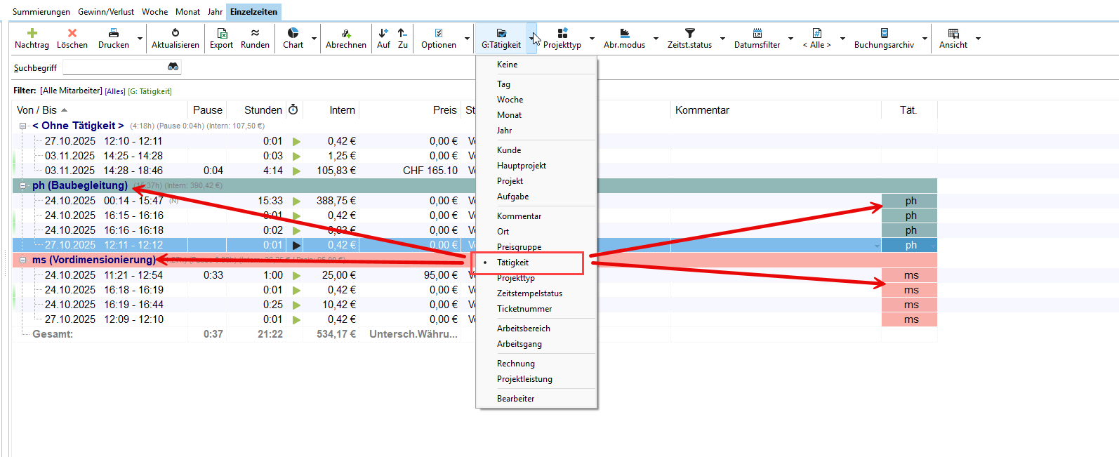 In der Auswertung können Sie die erfassten Zeiten auf Basis der Tätigkeiten gruppieren.