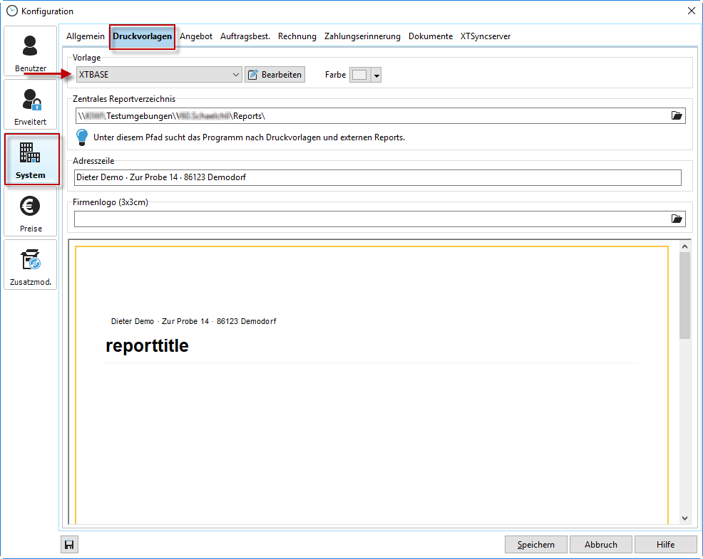 Im Xpert-Timer stehen Ihnen nach der Installation einige Druckvorlagen zur Verfügung. Diese können Sie bei Bedarf eingeschränkt nach Ihren Vorstellungen ändern. In diesem Reiter haben Sie bereits die Möglichkeit Ihre Adresse mit der von "Dieter Demo" zu ersetzen und Ihr Logo einzubinden.