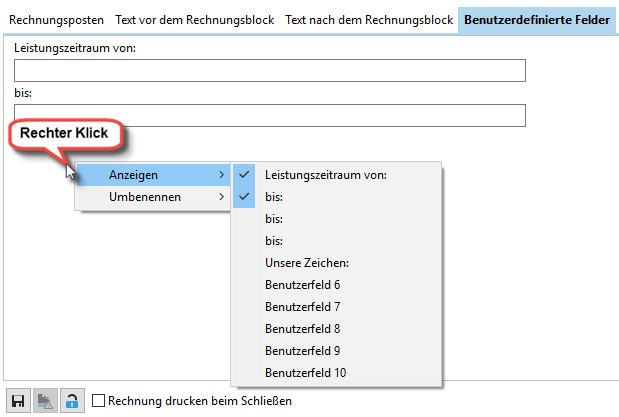 In der Rechnungsstellung können Sie benutzerdefinierte Felder anlegen, die Ihnen dann in Ihrer Rechnungsvorlage zur Verfügung stehen. Bitte beachten Sie, dass Ihre selbst angelegte Rechnungsvorlage nicht automatisch mit den neuen Feldern bestückt wird. Sie müssen diese Felder selbst in der Datenbankabfrage und auch in Ihrem Report einbinden. Eine Anleitung dazu finden Sie hier.