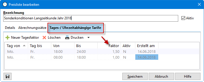 Tragen Sie im Reiter "Tages-/Uhrzeitabhängige Tarife" den entsprechenden Gültigkeitszeitraum für Ihre Abrechnungssätze ein. Sie können festlegen, wann genau die Preise Ihrer neuen Preisliste gelten sollen. So können Sie z.B. spezielle Aufschläge für Überstunden, Wochenendarbeit oder Feiertage anlegen. Nutzen Sie dazu den Faktor.