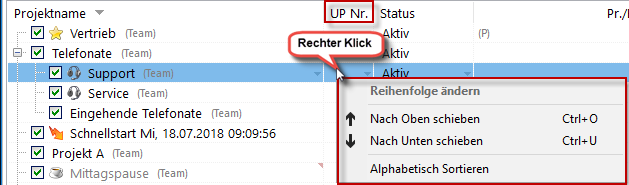 Arbeiten Sie im Mehrbenutzerbetrieb, kann es vorkommen, dass über die Sichtbarkeit der Projekte die Reihenfolge nicht "sortiert" ist. Per Rechtsklick auf die Spalte können Sie die UP (Unterprojektnummer) einblenden und entsprechend die Reihenfolge der Unterprojekte prüfen. Gleichzeitig können Sie hier auch die Funktion "Alphabetisch sortieren" nutzen. Dann werden neue UP Nummern vergeben und die Unterprojekte entsprechend sortiert.