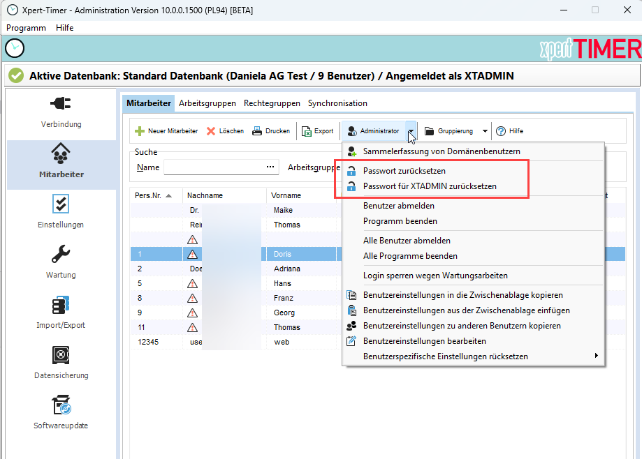 Sollte einer Ihrer Mitarbeiter sein Passwort zum Xpert-Timer vergessen, können Sie dieses mit Hilfe des Benutzers "XTADMIN" wieder zurücksetzen.