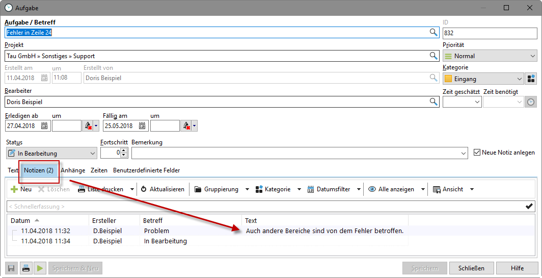 Sie möchten Informationen bezüglich der Aufgaben für Ihre Mitarbeiter hinterlegen? Dann können Sie die Notizfunktion im Aufgabendialog nutzen. Dort werden nicht nur Statusänderungen zur Aufgabe festgehalten, Sie können auch selbst die Notizen pflegen. Wird z.B. eine Aufgabe zurückgewiesen, können Sie hier den Grund der Zurückweisung notieren, so dass Ihr Kollege die Informationen zu Weiterbearbeitung erhält.
