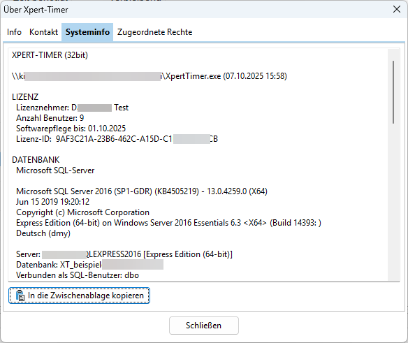 In der xperttimer.ini Datei werden Ihre Verbindungsdaten und persönlichen Einstellungen gespeichert. Wo Ihre .ini Datei liegt, sehen Sie unter dem Menüpunkt "Hilfe" im Projektmanager. Wählen Sie dort den Unterpunkt "Info über Xpert-Timer" und dann den Reiter "Systeminfo". Dort finden Sie noch weitere nützliche Angaben.