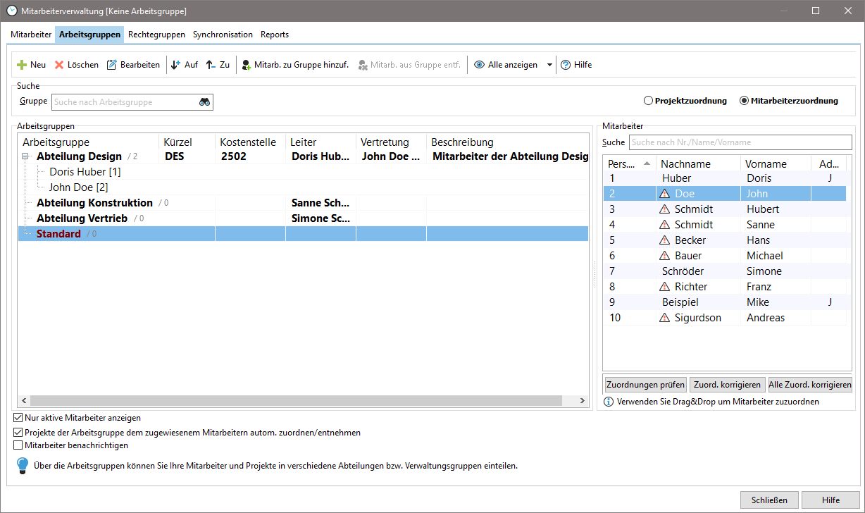 Weisen Sie nun im zweiten Schritt die angelegten Mitarbeiter per Drag&Drop einer Arbeitsgruppe zu: