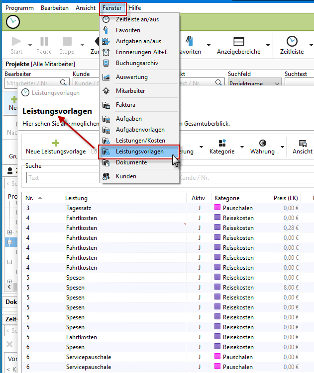 Im Menüpunkt "Fenster" können Sie sich unter "Leistungsvorlagen" eine Übersicht der erstellten Leistungsvorlagen anzeigen lassen. Diese Liste können Sie individuell weiter bearbeiten und neue Projektleistungen als Vorlagen anlegen.