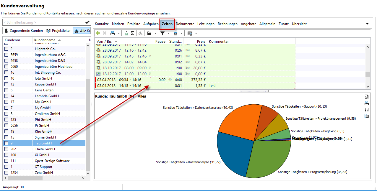 Es stehen Ihnen einige Filtermöglichkeiten zur Verfügung, falls Sie ein ganz bestimmtes Projekt, oder die Arbeitszeit eines bestimmten Mitarbeiters für Projekte dieses Kunden sehen möchten.
