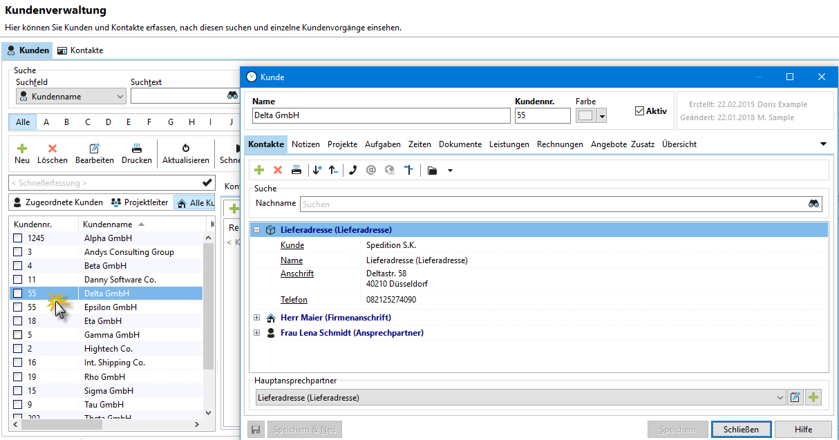 In der Kundenverwaltung sehen Sie einen Überblick über all Ihre Kunden. Auch einige Details zum Kunden werden Ihnen direkt angezeigt. Wenn Sie auf den Kunden doppelklicken, gelangen Sie in den Dialog 'Kunde', der Ihnen die Möglichkeit bietet, Kundendetails zu ändern oder nach bestimmten Kriterien zu filtern. Hier können Sie auch Rechnungen einsehen und Zusatzinformationen, wie z.B. die Kundenbeziehung angeben. Die Registerkarten sind zur Kundenverwaltung identisch, so dass wir im Kapitel Kundendaten auf die einzelnen Reiter eingehen werden.