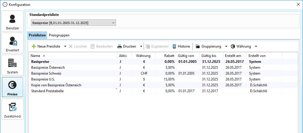 Wechseln Sie in der Konfiguration auf den Bereich "Preise". Hier sehen Sie die Unterteilung in die beiden Reiter "Preislisten" und "Preisgruppen".