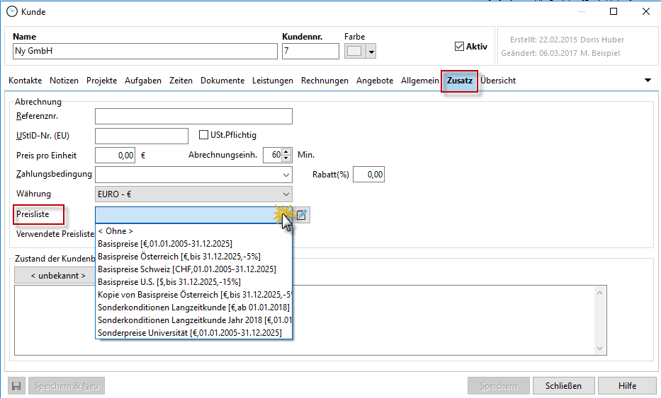 In den Kundendaten finden Sie die Preisliste im Reiter "Zusatz".