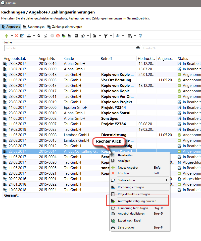 In der Faktura (Menüpunkt Fenster -> Faktura) können Sie per Rechtsklick auf ein Angebot eine Angebotsbestätigung erzeugen.