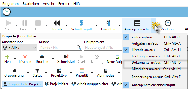 Um die Ihren Projekten zugeordneten Dokumente auch im Projektmanager anzuzeigen, können Sie den Dokumentenbereich über den Menüpunkt "Ansicht" -> "Dokumente an/aus" ein- bzw. ausblenden.