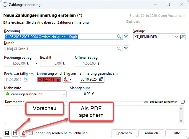 Es öffnet sich ein Dialog, in dem Sie bitte alle nötigen Daten zur Zahlungserinnerung eingeben. Über die Vorschau können Sie sich die Zahlungserinnerung ansehen und die Zahlungserinnerung als PDF speichern.