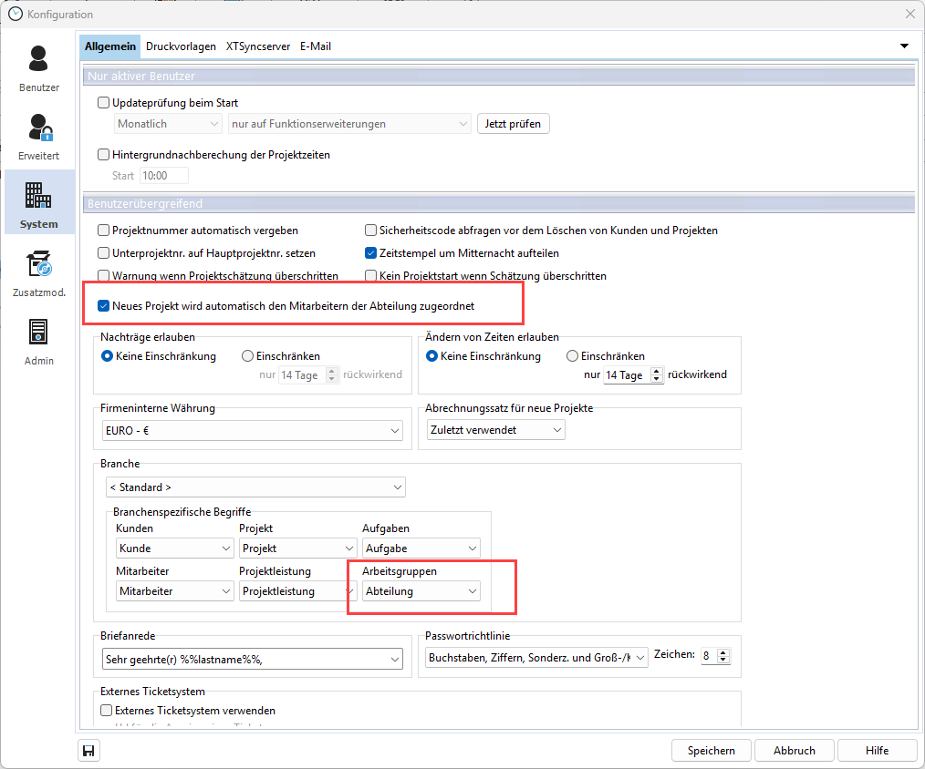 Zusätzlich können Sie an dieser Stelle setzen, dass jedes neue Projekt automatisch allen Mitarbeitern der Arbeitsgruppe zugeordnet wird.