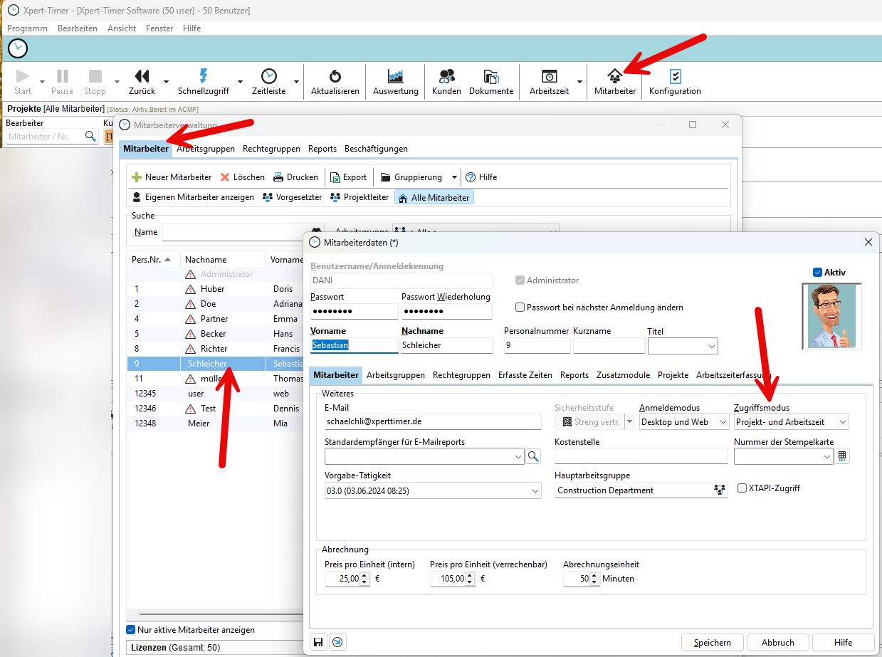 1.Weisen Sie jedem Mitarbeiter das Zusatzmodul im Zugriffsmodus zu. Dazu doppelklicken Sie einen Mitarbeiternamen in der Mitarbeiterliste und öffnen die Mitarbeiterdaten. Dort finden Sie den Zugriffsmodus.