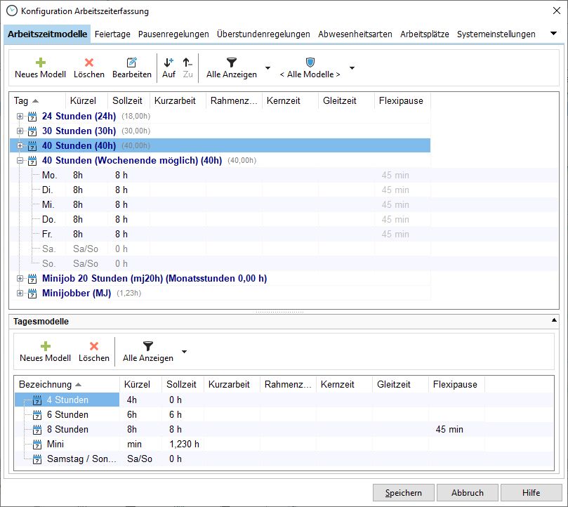 Im Xpert-Timer können Sie beliebig viele Arbeitszeitmodelle anlegen. Sie finden die Übersicht der Modelle in der Konfiguration der Arbeitszeiterfassung im Reiter "Arbeitszeitmodelle".