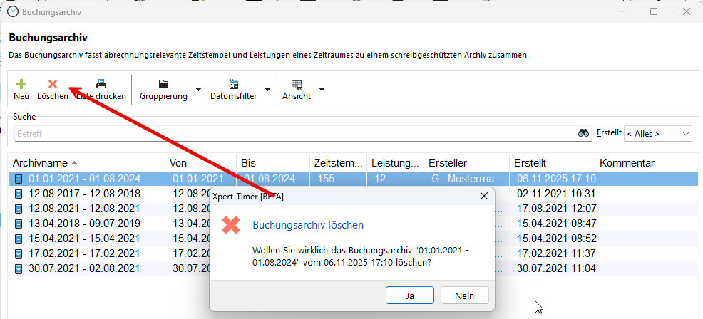 Haben Sie versehentlich einen falschen Zeitraum in Ihrem Buchungsarchiv ausgewählt, dann löschen Sie das gesamte Archiv nochmals. Damit werden auch alle Einträge wieder auf den ursprünglichen Zustand gesetzt. Nach dem Löschen können Sie das Buchungsarchiv neu anlegen.