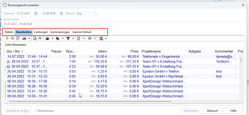 Per Doppelklick auf das neu angelegte Buchungsarchiv sehen Sie, dass auch die Reiter "Einzelzeiten", "Leistungen", "Summierungen" und "Gewinn/Verlust" aktiv sind. Damit können Sie die festgeschriebenen Zeitstempel einsehen.