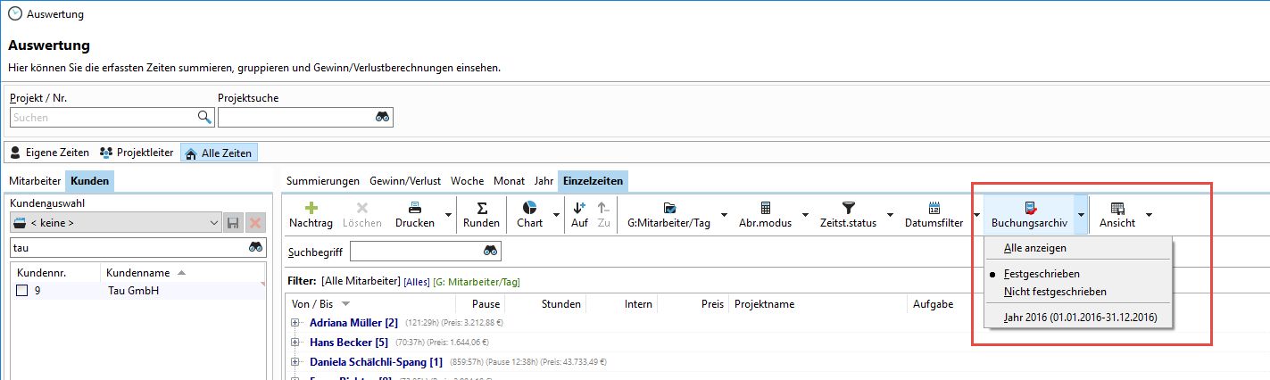 Im Auswertungsdialog finden Sie einen Filter zum Buchungsarchiv. Dort können Sie wählen, welche Zeitstempel Sie in der Auswertung angezeigt bekommen möchten.