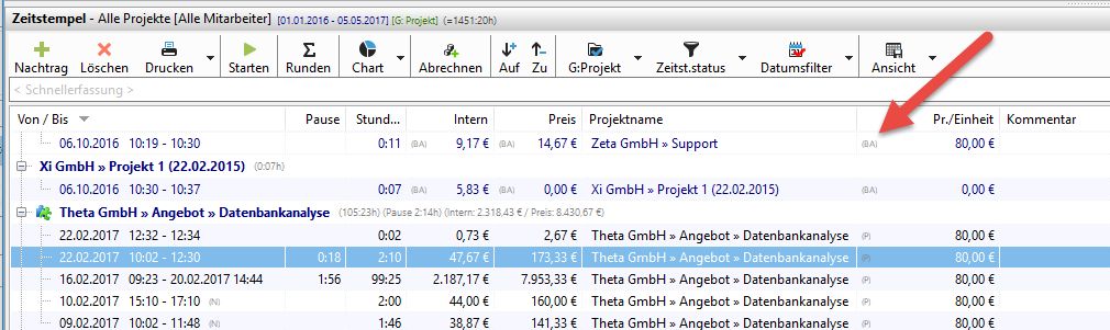 Auch in der Zeitstempelliste werden die Preise aus dem Buchungsarchiv dargestellt. Wird ein Preis aus dem Archiv berechnet sehen Sie dies an der Anzeige (BA) für Buchungsarchiv in der Spalte "Pr./Einheit" in der Zeitstempelliste.