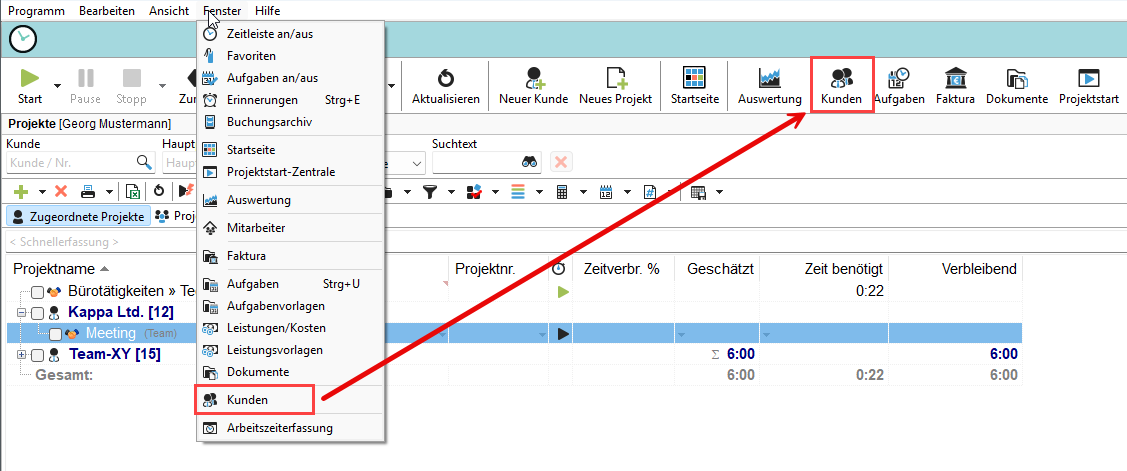 Zur Kundenverwaltung gelangen Sie über den Menüpunkt "Fenster" und die Auswahl "Kunden" im Projektmanager oder über den Knopf "Kunden".