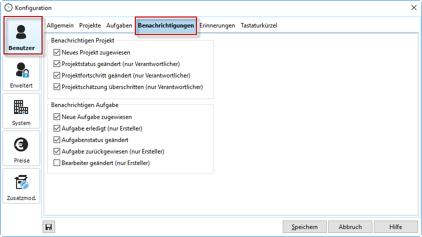 Entscheiden Sie hier, wann Sie auf Ihrem Bildschirm benachrichtigt werden. Es öffnet sich jeweils eine kleine Message-Box für jede Benachrichtigung.