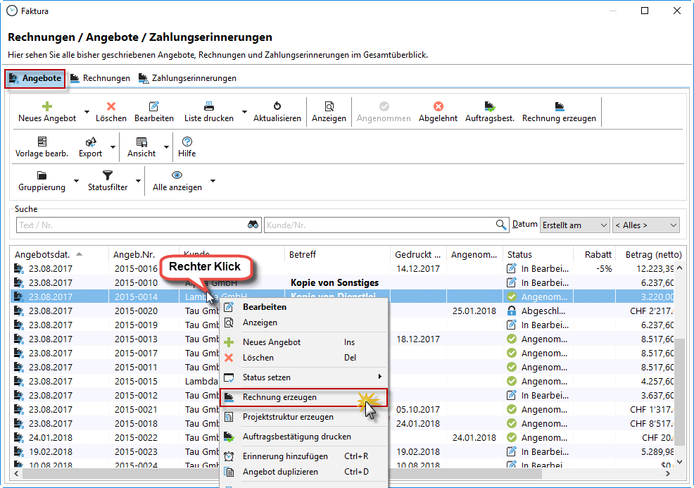 Aus einem erstellten Angebot können Sie Ihre Rechnungen erzeugen. Dazu klicken Sie mit der rechten Maustaste auf ein Angebot und wählen "Rechnung erzeugen".