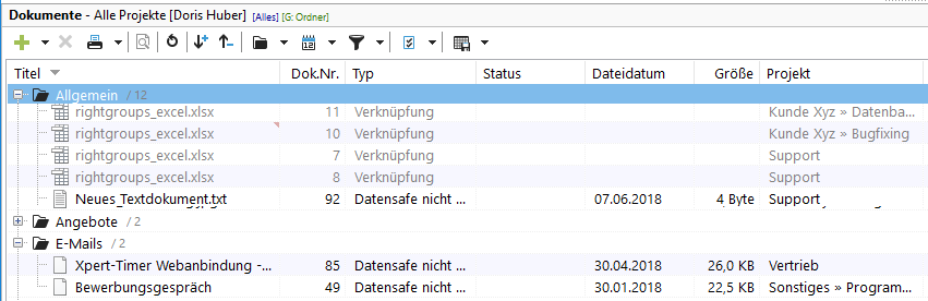 Um die Ihren Projekten zugeordneten Dokumente auch im Projektmanager anzuzeigen, können Sie den Dokumentenbereich über den Menüpunkt "Ansicht" -> "Dokumente an/aus" ein- bzw. ausblenden.