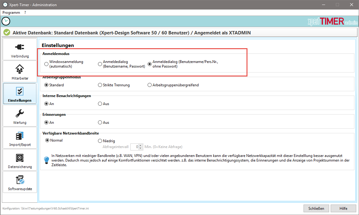 Damit wird beim Start über die Verknüpfung automatisch der Login-Dialog geöffnet. Alternativ können Sie den Login-Dialog auch aufrufen, indem Sie beim Start des Xpert-Timer die Hochstelltaste gedrückt halten.
