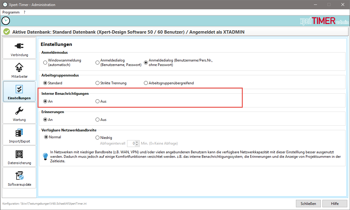 Innerhalb Xpert-Timer erhalten die Mitarbeiter Nachrichten, wenn z.B. dem Mitarbeiter ein neues Projekt zugeordnet wurde oder eine Aufgabe. Diese Nachrichten erscheinen in einer kleinen Dialogbox im Windows Traybar. Um Bandbreite einzusparen, z.B. bei langsamer Netzwerkverbindung, können Sie diese internen Benachrichtigungen an dieser Stelle abschalten.