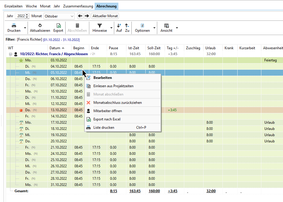 Genehmigte und Abgeschlossene Zeiten können nicht mehr verändert werden. Erst, wenn der Vorgesetzte den Monatsabschluss wieder zurückzieht, dann können Änderungen an den Zeiten vorgenommen werden. Ein Rechtsklick auf einen abgeschlossenen Monat bietet die Option "Monatsabschluss zurückziehen".