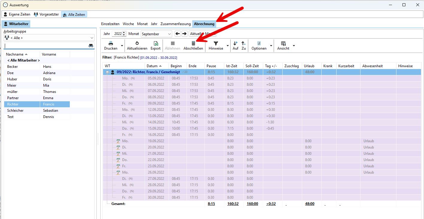 Die Personalabteilung letztendlich setzt dann die erfassten Zeiten auf den Status "Abgerechnet".