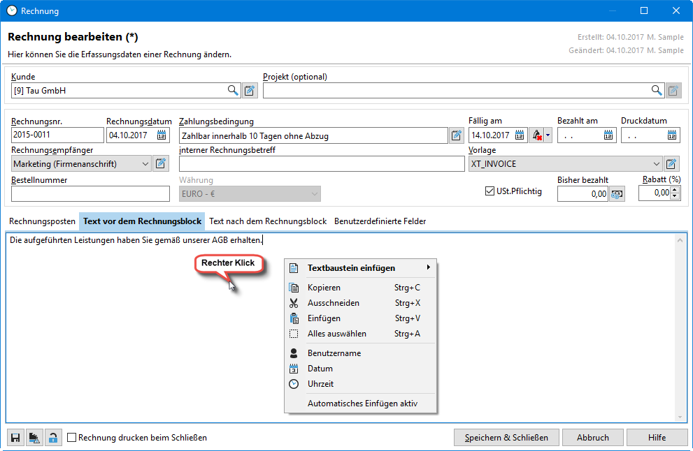 Wechseln Sie auf den Reiter "Text vor dem Rechnungsblock". Jetzt können Sie einen beliebigen Text eingeben oder per Rechtsklick definierte Textbausteine einfügen.