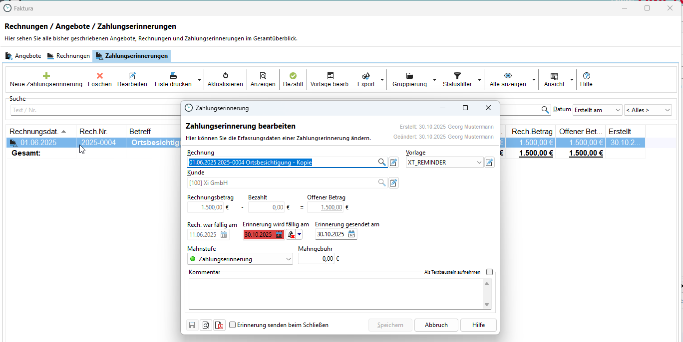 Im Dialog "Zahlungserinnerung bearbeiten" können Sie die Erfassungsdaten einer erstellen Zahlungserinnerung ändern. Um eine Zahlungserinnerung zu bearbeiten, doppelklicken Sie den Eintrag in der entsprechenden Liste.