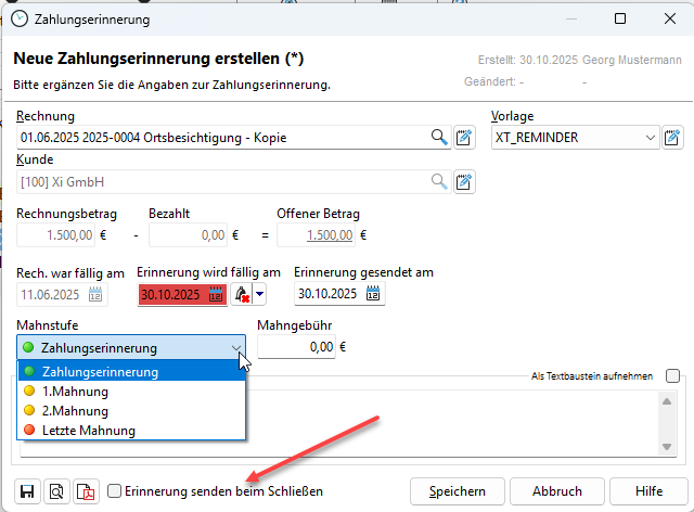 Vergeben Sie die entsprechende Mahnstufe, bevor Sie die Zahlungserinnerung verschicken.