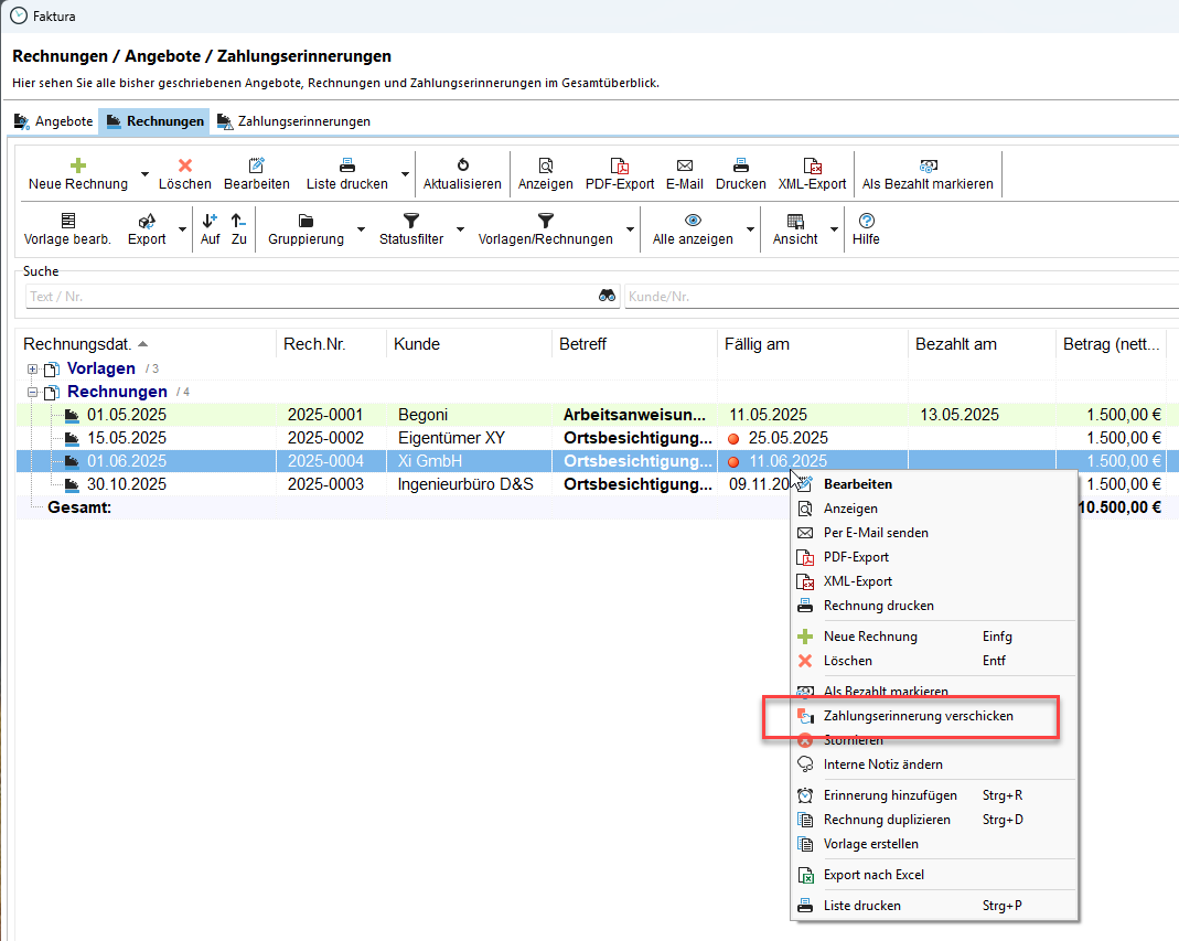Per Rechtsklick auf eine Rechnung (blau unterlegt) können Sie eine Zahlungserinnerung erzeugen:
