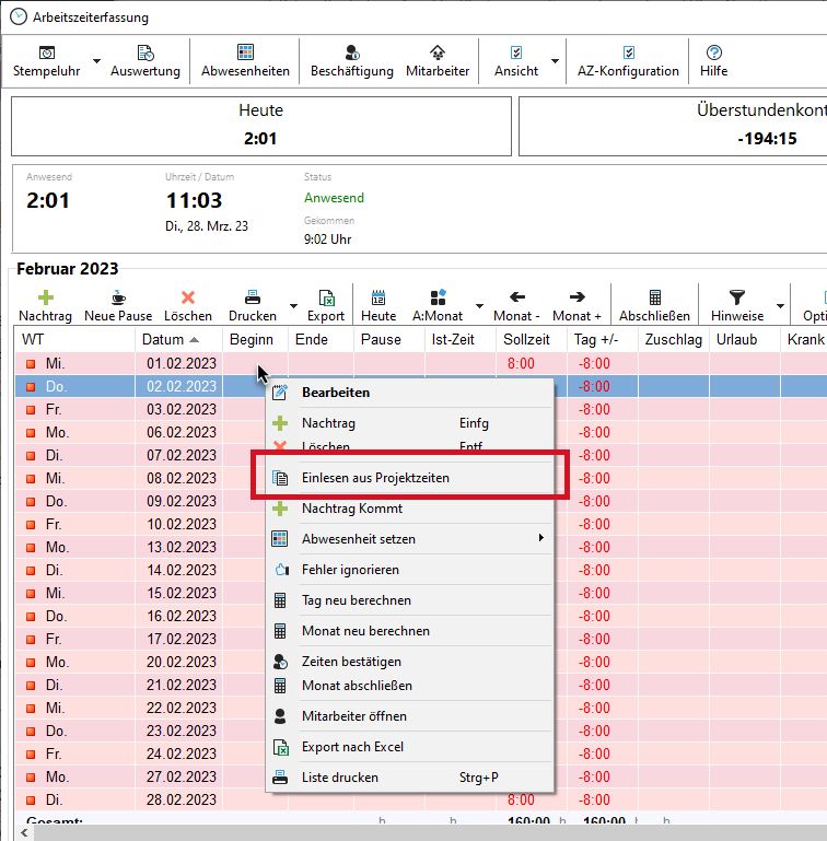 2. Am Ende des Monats können Sie dann per Rechtsklick die Projektzeiten in die Arbeitszeiterfassung einlesen. Sie können das auch im Laufe des Monats tun, allerdings müssen Sie daran denken, dass bei Änderungen der Zeitstempel in der Projektzeiterfassung die Daten dann nicht nochmal mit der Arbeitszeiterfassung ausgetauscht werden. Sie müssten dann den Arbeitstag in der Arbeitszeiterfassung komplett löschen und nochmal die Projektzeiten einlesen.