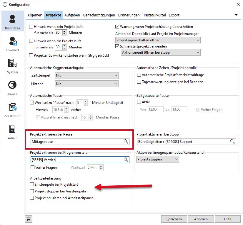 Setzen Sie dann ein Pausenprojekt, welches gestartet wird, wenn Sie den Knopf "Pause" in der Projektzeiterfassung drücken. Sie können das selbe Projekt auch für die "Stop" Aktion festlegen, wenn Sie auch bei der Aktion "Stopp" die Zeit als Arbeitszeitpause sehen möchten.