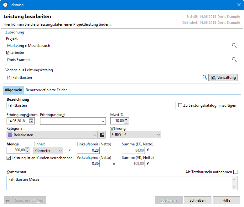 Per Doppelklick auf eine erfasste Leistung gelangen Sie in das Dialogfenster "Leistung bearbeiten" und können hier Änderungen an der von Ihnen erfassten Leistung vornehmen.