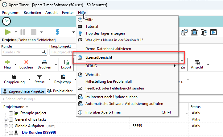 Den Code können Sie dann entweder im abgelaufenen Test-Dialgo eingeben, oder in der Lizenzübersicht. Diese finden Sie im Projektmanager im Menüpunkt "Hilfe" -> Lizenzübersicht.