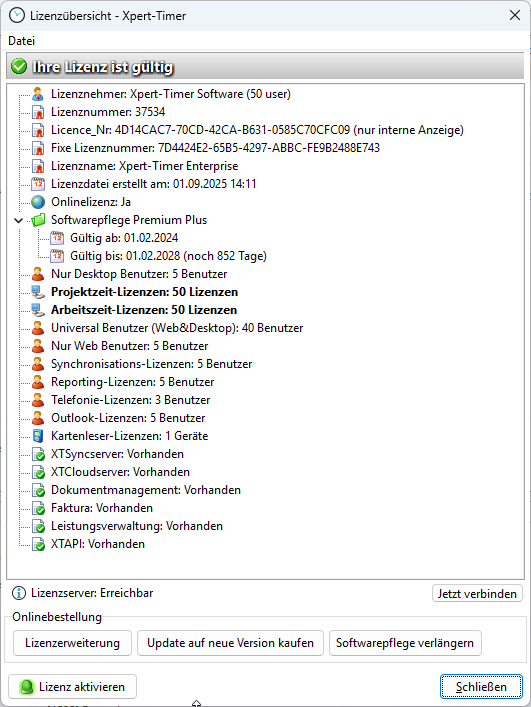 In der Lizenzübersicht sehen Sie, welche Module Ihnen zur Verfügung stehen und wie viele Mitarbeiter für den Xpert-Timer registriert sind. In der Demoversion haben Sie insgesamt 30 Tage Testzeit, 1 oder 10 Benutzer (je nachdem was Sie bei der Installation angegeben haben) und 2 Synchronisationslizenzen. Alle Angaben finden Sie auch im Dialog "Lizenzübersicht".