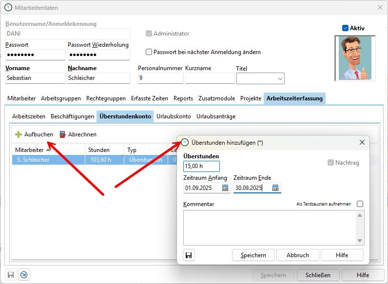 Hr. Schleicher nutzt seit 1.09. die Arbeitszeiterfassung im Xpert-Timer. Er hat aus dem Jahr noch 15 Überstunden. Im System legen Sie die Buchung für den Monat Septembar an, da für Hr. Schleicher eine Beschäftigung ab September gilt. Die Überstunden werden dann nach Ablauf des Monats September im System bei der Kalkulation berücksichtigt.