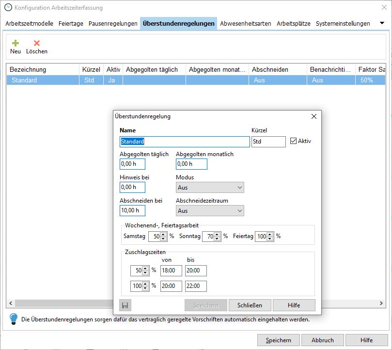 Zuschläge bei Wochenend- und Feiertagsarbeit können Sie hier ebenso hinterlegen, sowie Zuschlagszeiten. Die erfassten Stunden werden dann entsprechend multipliziert.