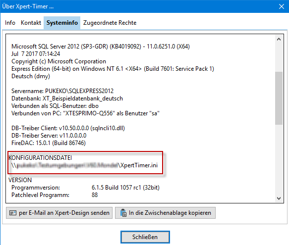 Um die Reports, die aus dem Xpert-Timer System generiert werden, anzupassen, können Sie die XpertTimer.ini Datei entsprechend anpassen. Den Pfad zu Ihrer xperttimer.ini Datei finden Sie im Projektmanager im Menüpunkt "Hilfe" -> Info über Xpert-Timer -> Systeminfo.