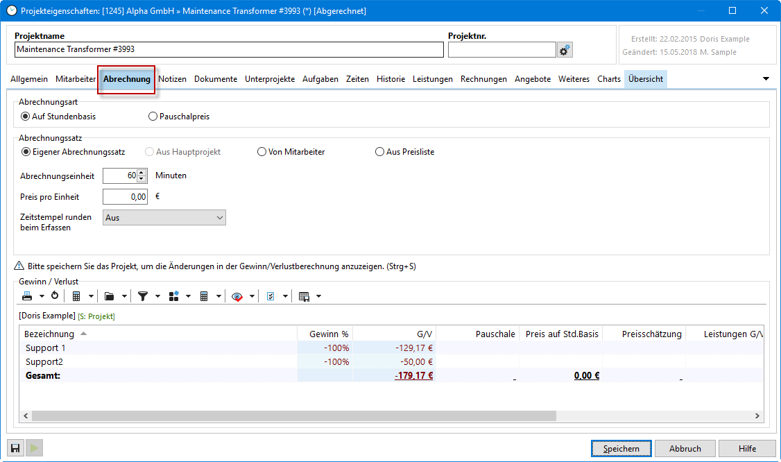 Projekteigenschaften - Abrechnung